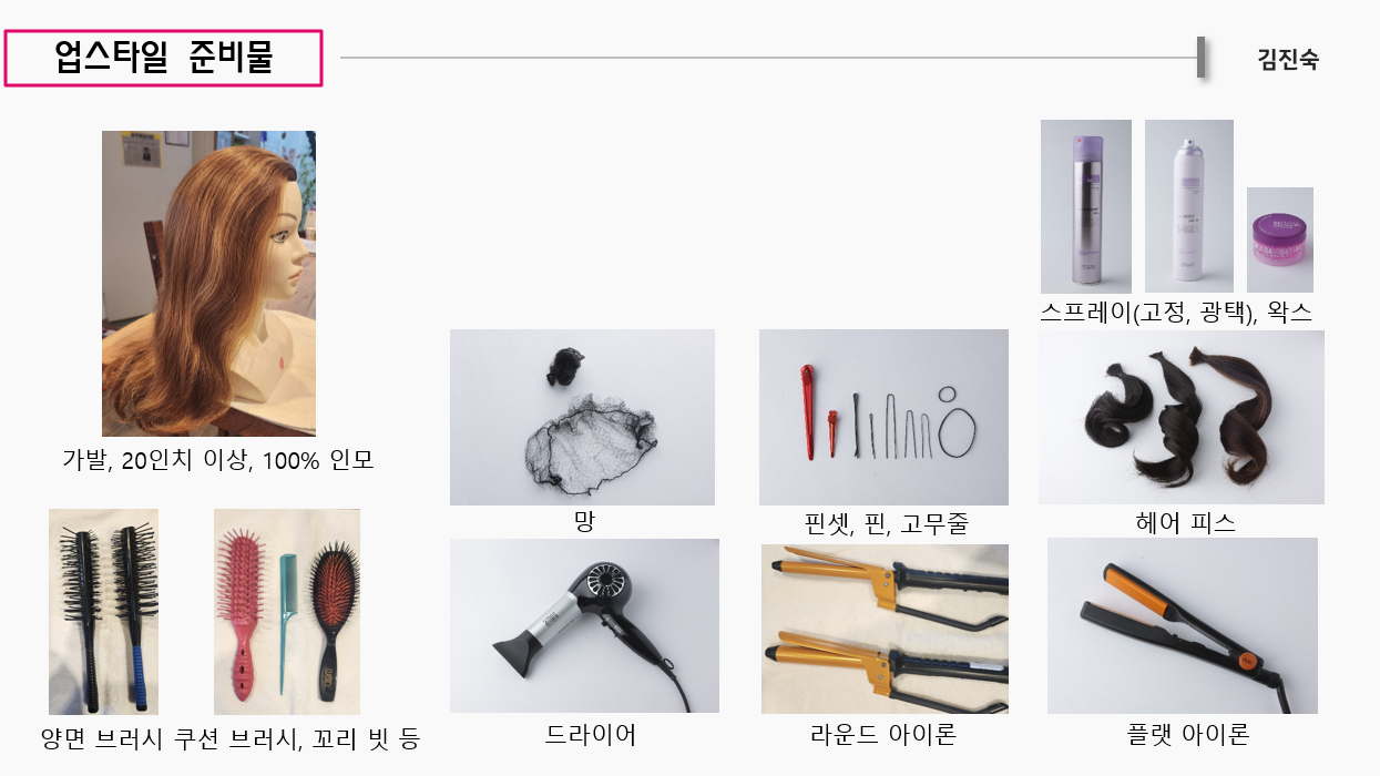 수업참여시 준비물(기본 준비물 외) : 마네킹 20인치 이상 인모, 양면 브러시, 쿠션브러시, 꼬리빗 등, 드라이, 망, 핀셋, 라운드아이론, 플랫아이론, 스프레이, 헤어피스, 플랫아이롱 등 (아래하단 이미지 참고)